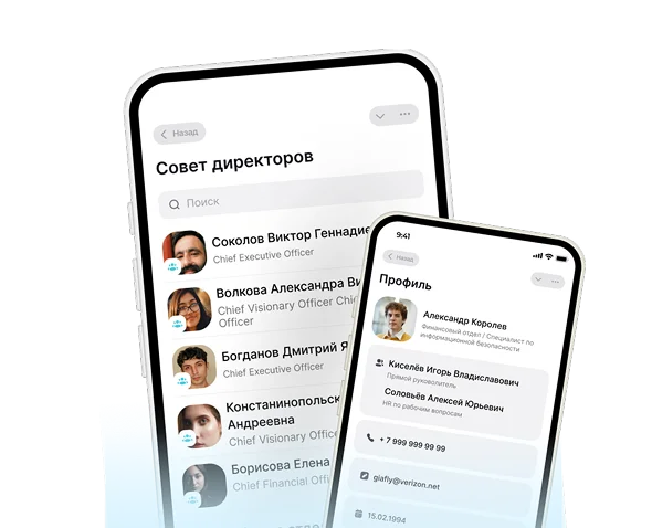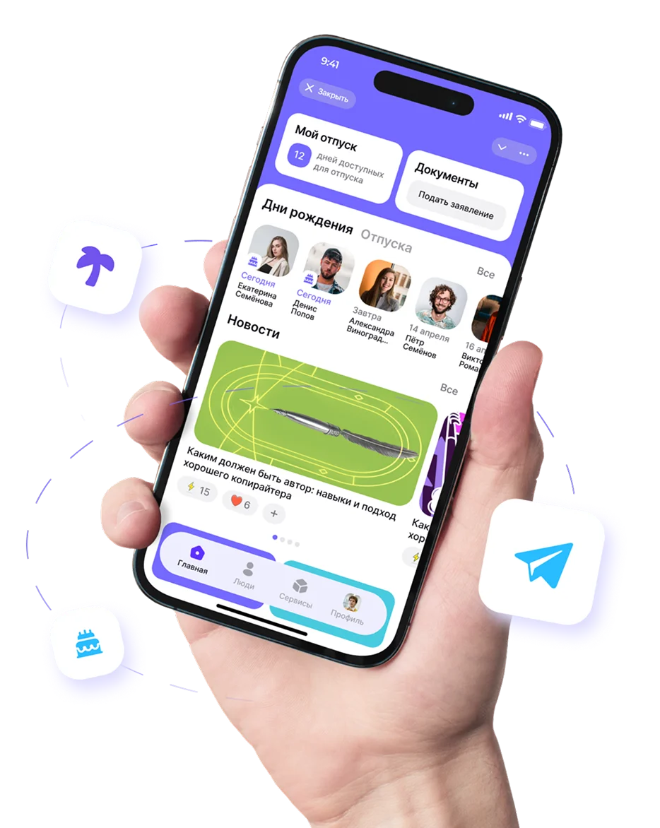 оргструктура организации с ключевыми данными сотрудников, график отпусков и напоминания о днях рождениях коллег, онбординг, регламенты, важные документы компании в одном месте.